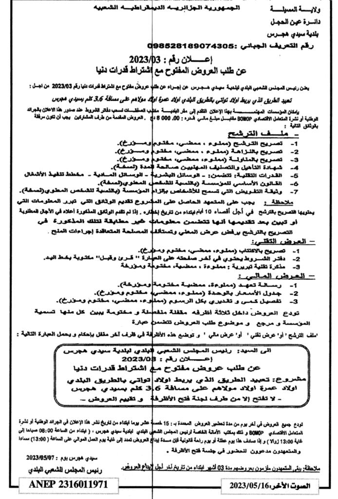 إعلان عن طلب عروض مفتوح 2023/03 بلدية سيدي هجرس