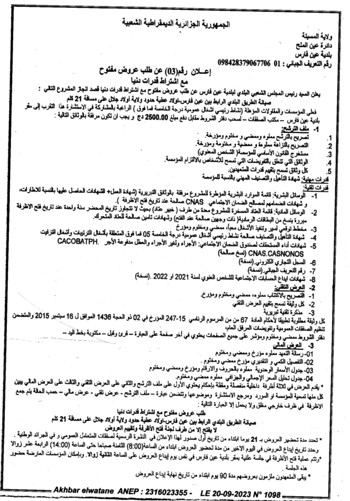 إعلان عن طلب عروض مفتوح 2023/03 بلدية عين فارس