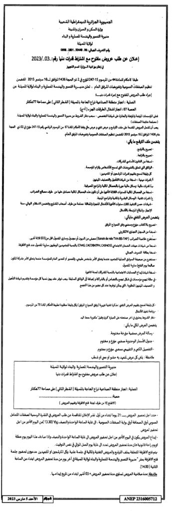 إعلان عن طلب عروض مفتوح 2023/03 مديرية التعمير والهندسة المعمارية والبناء لولاية المسيلة