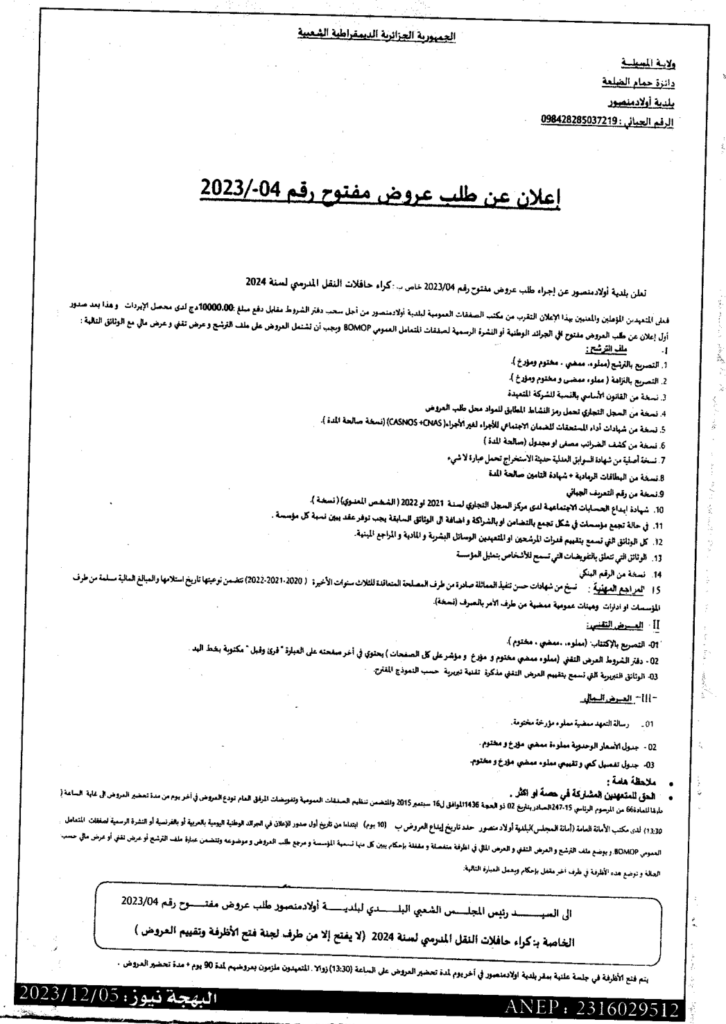 إعلان عن طلب عروض مفتوح 2023/04 بلدية أولاد منصور