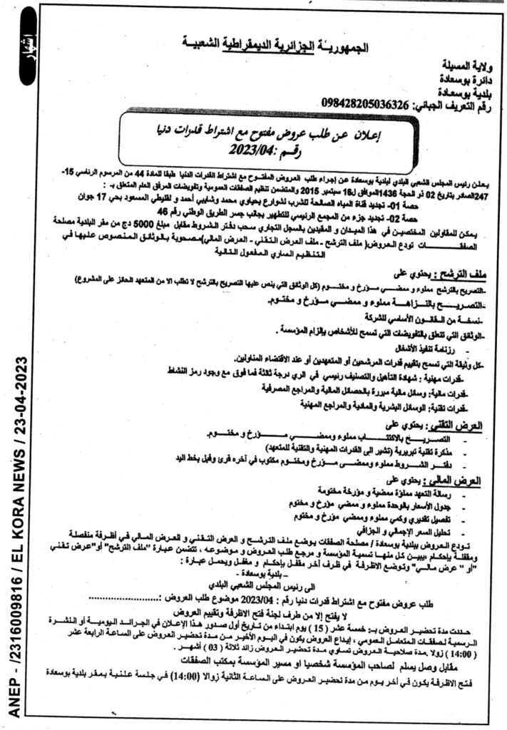 إعلان عن طلب عروض مفتوح 2023/04 بلدية بوسعادة