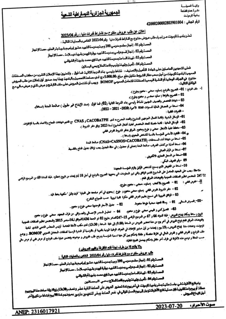 إعلان عن طلب عروض مفتوح 2023/04 بلدية تارمونت