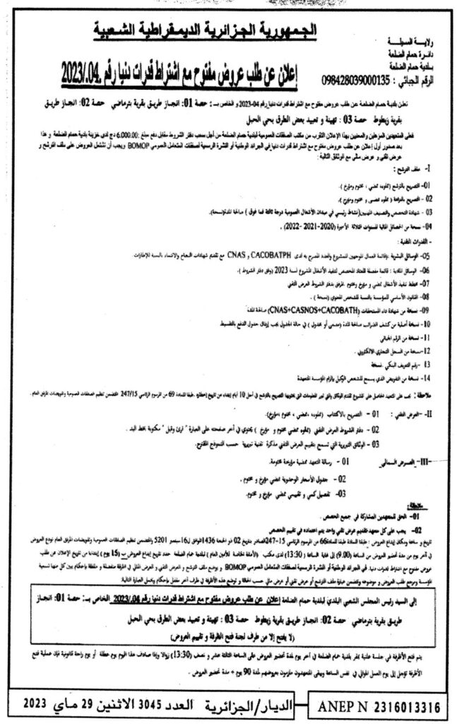 إعلان عن طلب عروض مفتوح 2023/04 بلدية حمام الضلعة