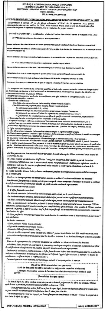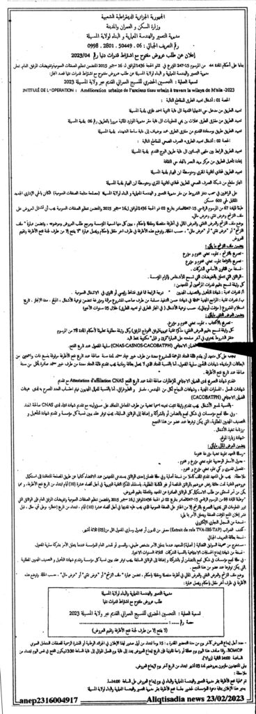 إعلان عن طلب عروض مفتوح 2023/04 مديرية التعمير والهندسة المعمارية لولاية المسيلة
