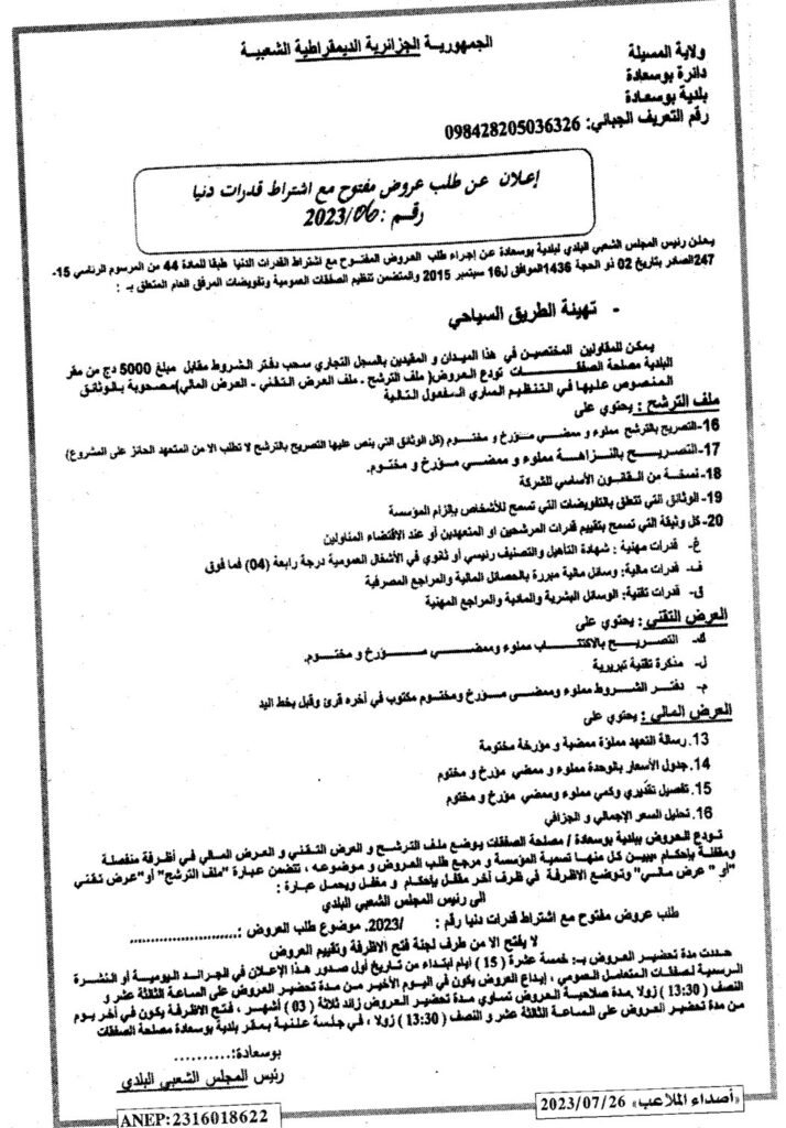 طلب العروض المفتوح مع اشتراط قدرات دنيا المتعلق بـ : تهيئة الطريق السياحي26 يوليو، 20230 12 شاركها فيسبوك X مشاركة عبر البريد طباعة