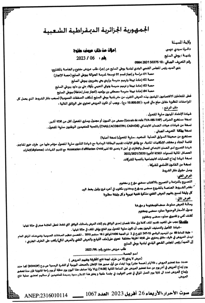 إعلان عن طلب عروض مفتوح 2023/06 بلدية بوطي السايح