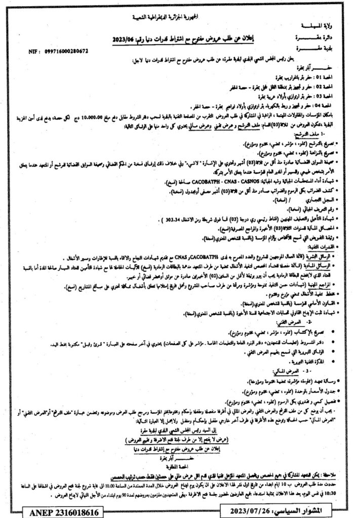 طلب عروض مفتوح مع اشتراط قدرات دنيا لأجل: حفر آبار بمقرة26 يوليو، 20230 17 شاركها فيسبوك X مشاركة عبر البريد طباعة