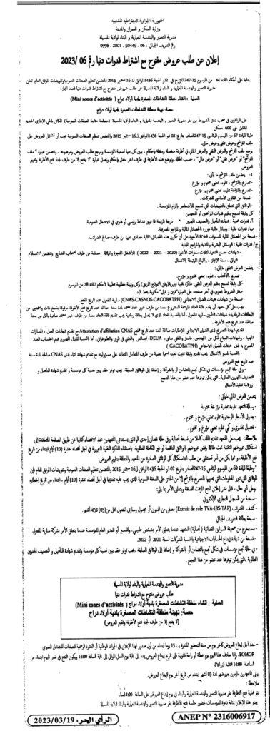 طلب عروض مفتوح مع اشتراط قدرات دنيا قصد انجاز العملية: انشاء منطقة النشاطات المصغرة بلدية أولاد دراج19 مارس، 20230 15 شاركها فيسبوك X مشاركة عبر البريد طباعة