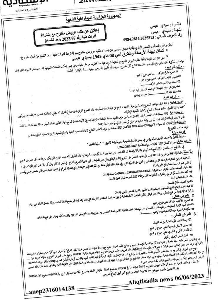 إعلان عن طلب عروض مفتوح 2023/07 بعد الفسخ بلدية سيدي عيسى