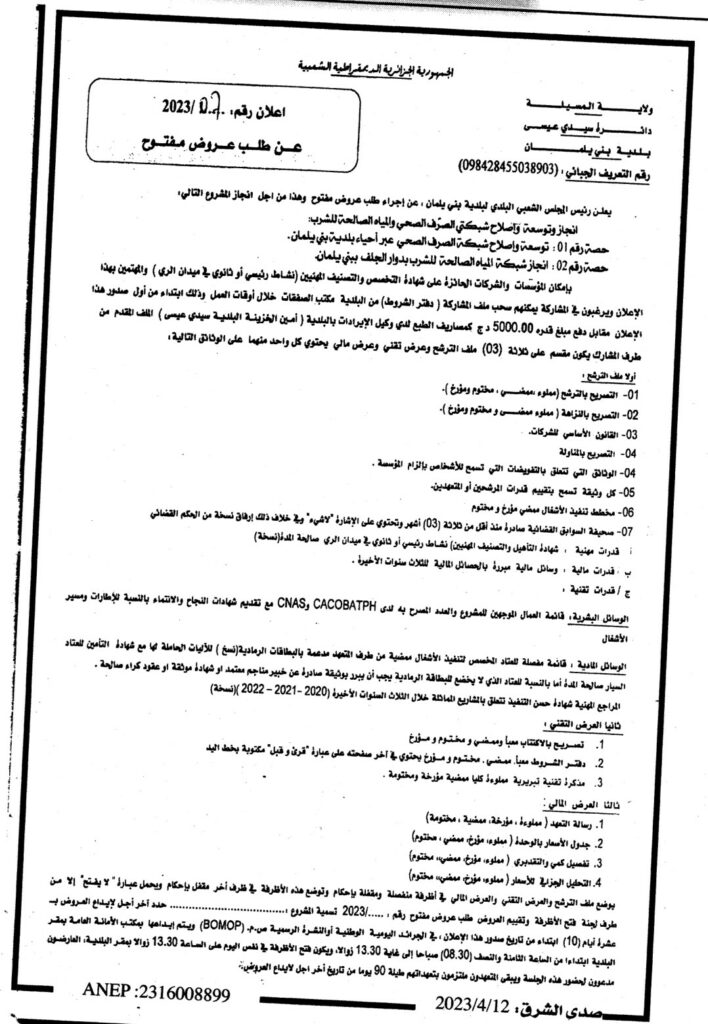 إعلان عن طلب عروض مفتوح 2023/07 بلدية بني يلمان