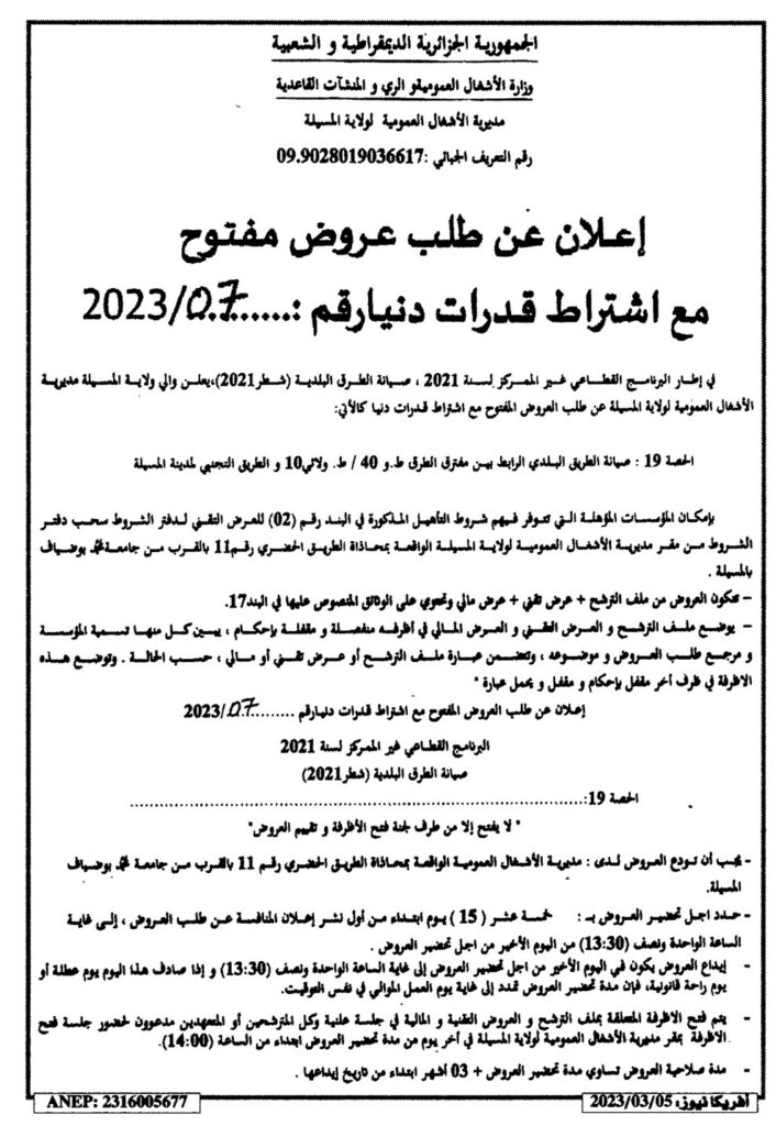 إعلان عن طلب عروض مفتوح 2023/07 مديرية الأشغال العمومية لولاية المسيلة