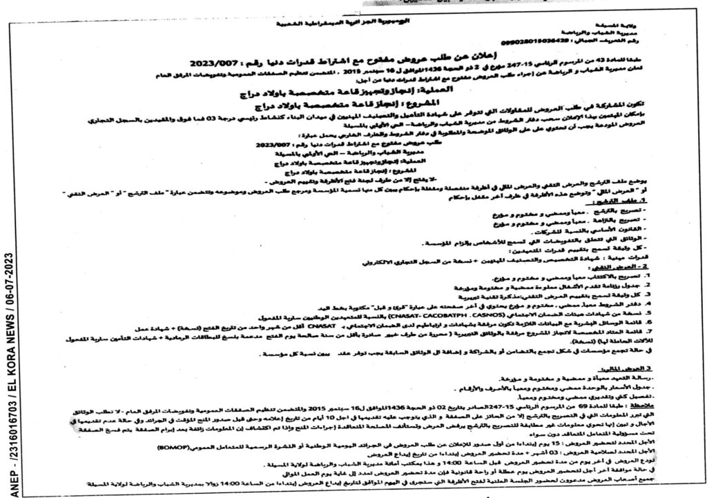 إعلان عن طلب عروض مفتوح 2023/07 مديرية الاشغال العمومية لولاية المسيلة