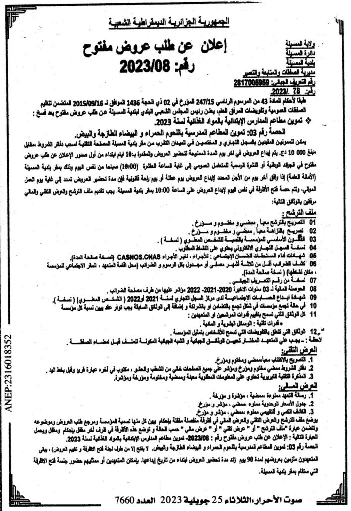 طلب عروض مفتوح بعد فسخ: تموين مطاعم المدرسية باللحوم الحمراء والبيضاء الطازجة والبيض25 يوليو، 20230 23 شاركها فيسبوك X مشاركة عبر البريد طباعة