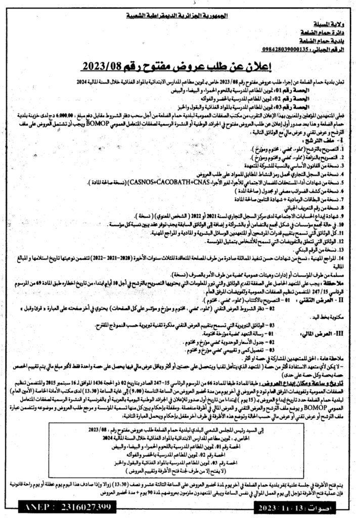إعلان عن طلب عروض مفتوح 2023/08 بلدية حمام الضلعة