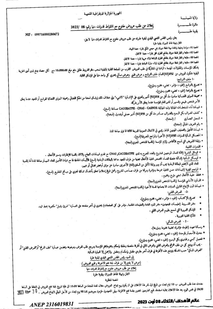 طلب عروض مفتوح مع اشتراط قدرات دنيا لأجل: انجاز وتهيئة نقاط الدوران ببلدية مقرة8 أغسطس، 20230 28 شاركها فيسبوك X مشاركة عبر البريد طباعة
