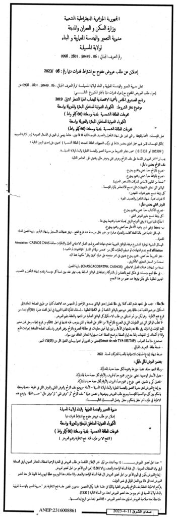 إعلان عن طلب عروض مفتوح 2023/08 مديرية التعمير والهندسة المعمارية لولاية المسيلة