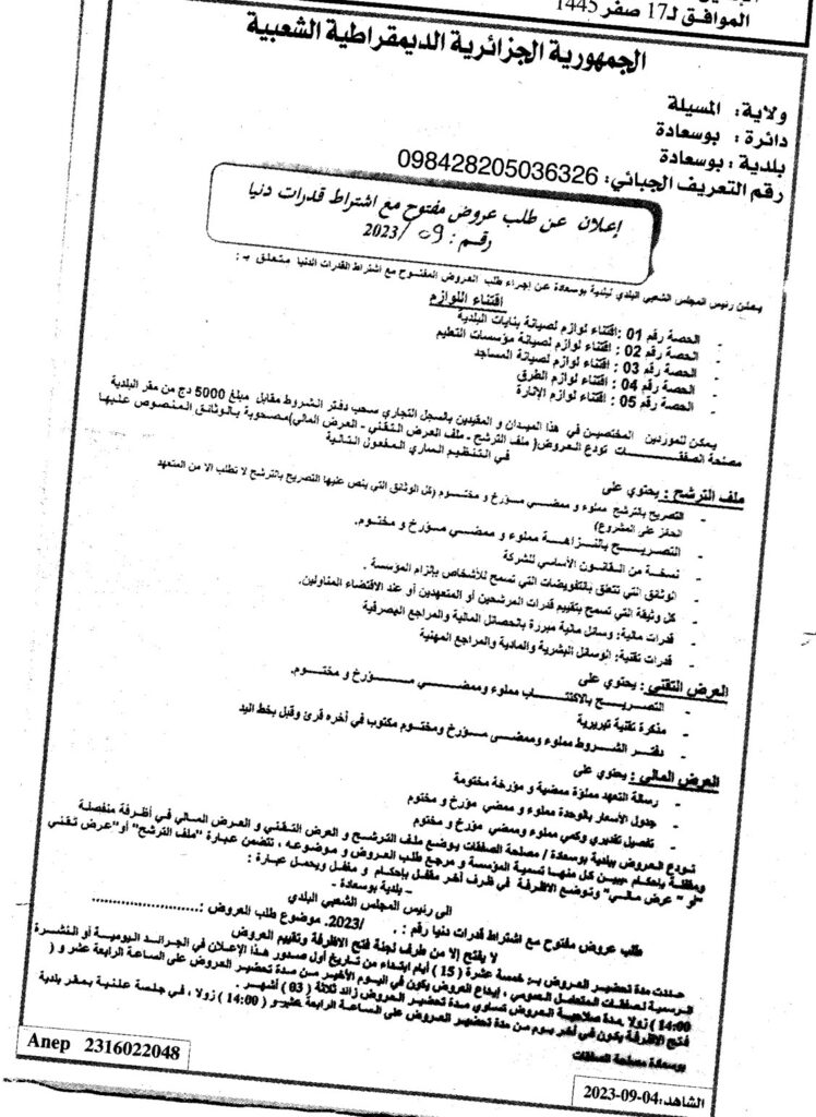 إعلان عن طلب عروض مفتوح 2023/09 بلدية بوسعادة