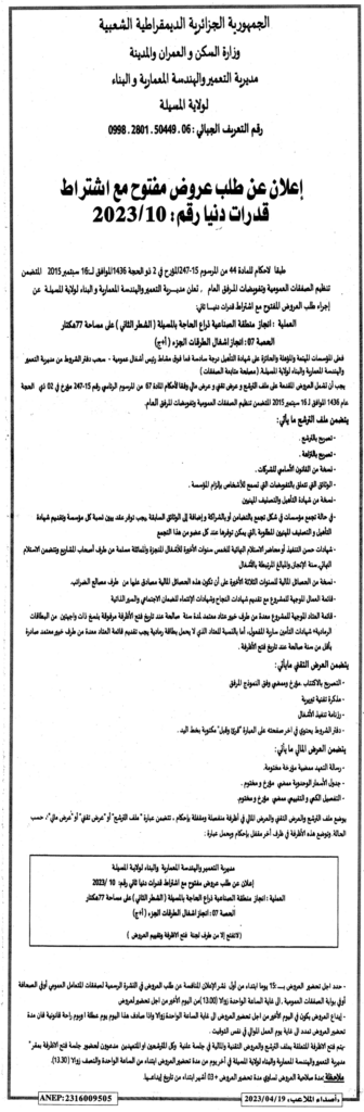 طلب عروض مفتوح مع اشتراط قدرات دنيا العملية: انجاز منطقة الصناعية دراع الحاجة بالمسيلة (الشطر الثاني) على مساحة 77 هكتار19 أبريل، 20230 11 شاركها فيسبوك X مشاركة عبر البريد طباعة