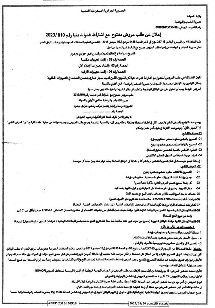 إعلان عن طلب عروض مفتوح 2023/10 مديرية الشباب والرياضة لولاية المسيلة