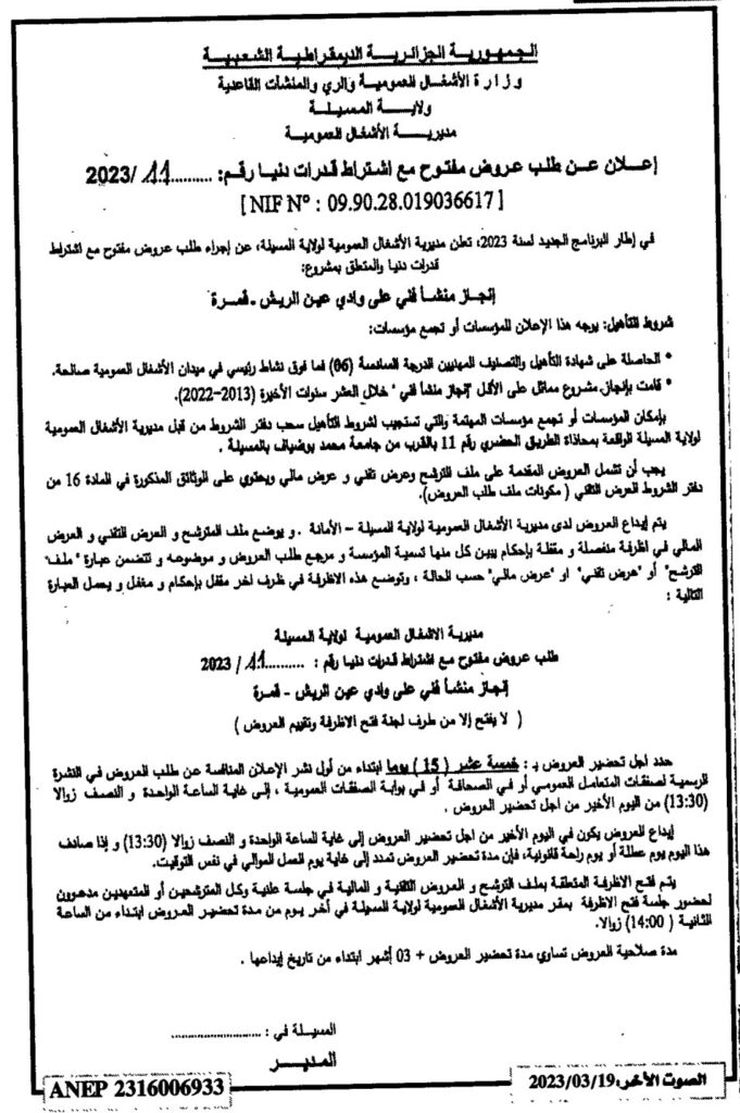 طلب عروض مفتوح مع اشتراط قدرات دنيا والمتعلق بمشروع: انجاز منشأ فني على وادي عين الريش-قمرة19 مارس، 20230 20 شاركها فيسبوك X مشاركة عبر البريد طباعة
