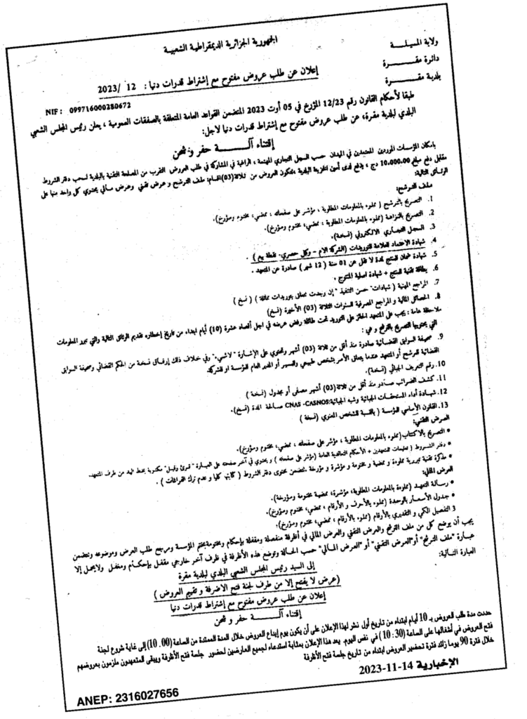 إعلان عن طلب عروض مفتوح 2023/12 بلدية مقرة