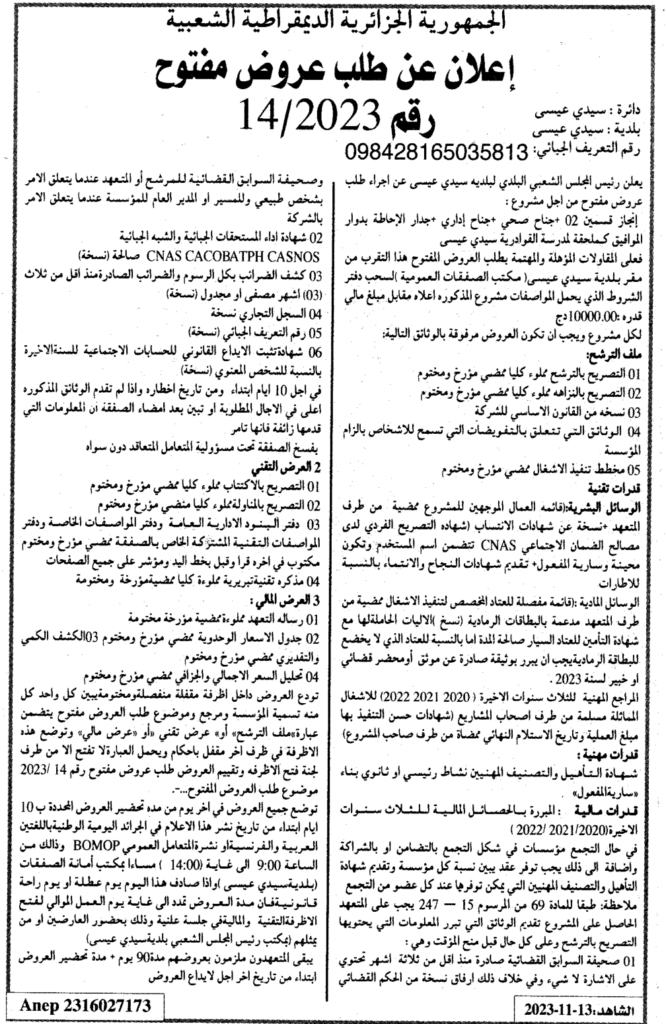 إعلان عن طلب عروض مفتوح 2023/14 بلدية سيدي عيسى