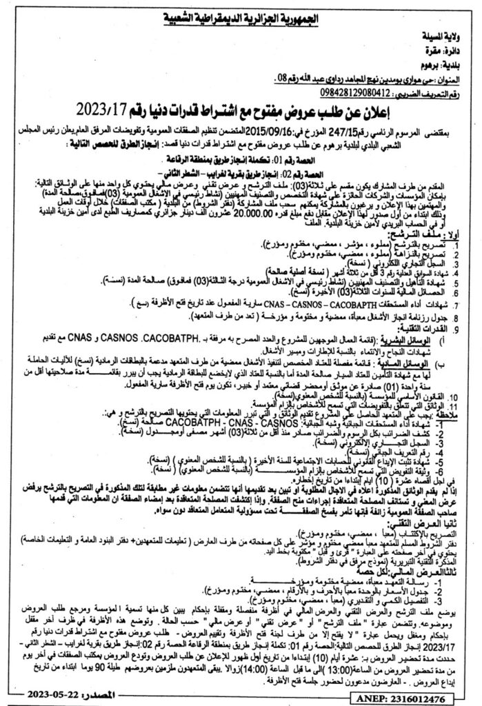 طلب عروض مفتوح مع اشتراط قدرات دنيا قصد: انجاز الطرق للحصص التالية:الحصة رقم 01: تكملة انجاز طريق بمنطقة الرقاعةالحصة رقم 02: انجاز طريق بقرية لغرايب -الشطر الثاني-22 مايو، 20230 39 شاركها فيسبوك X مشاركة عبر البريد طباعة