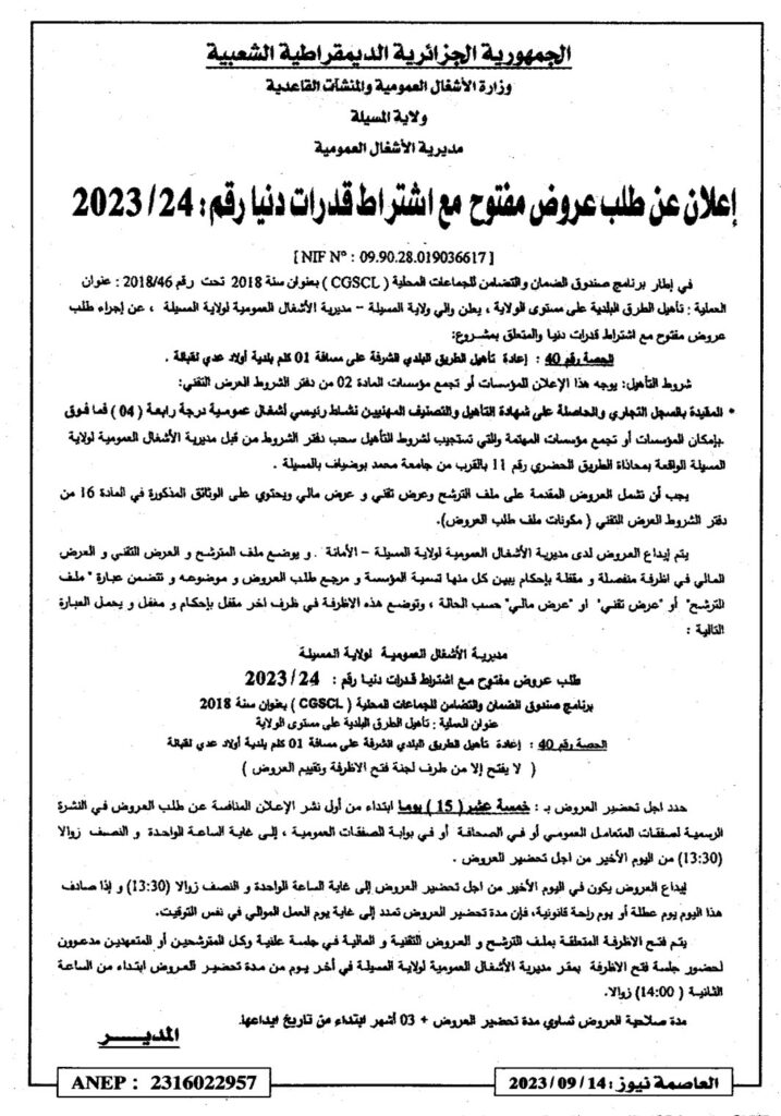إعلان عن طلب عروض مفتوح 2023/24 مديرية الأشغال العمومية لولاية المسيلة