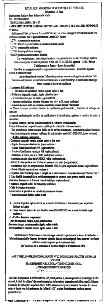 إعلان عن طلب عروض مفتوح 2024/01 المؤسسة العمومية للصحة الجوارية بالمسيلة