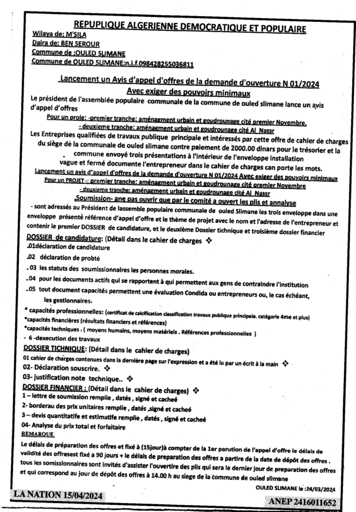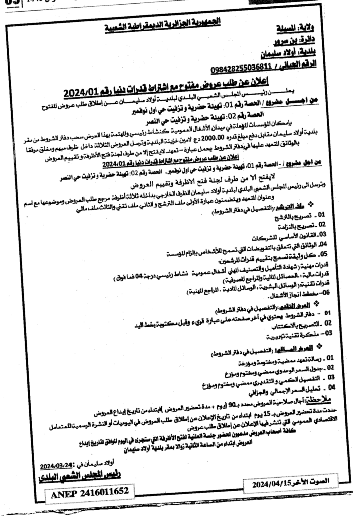 إعلان عن طلب عروض مفتوح 2024/01 بلدية أولاد سليمان