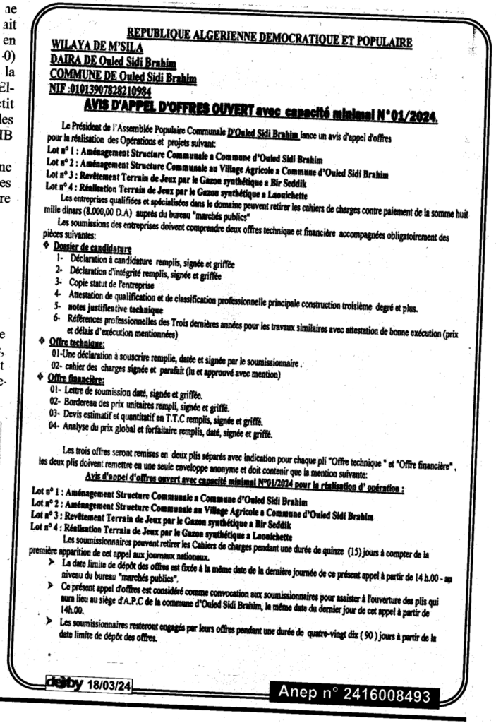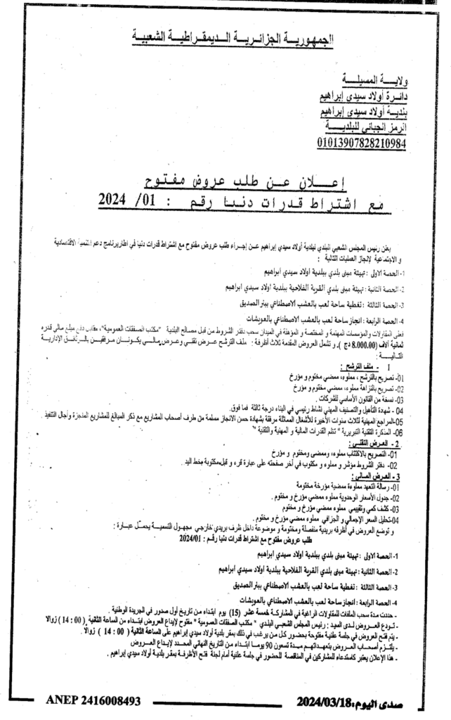 إعلان عن طلب عروض مفتوح 2024/01 بلدية أولاد سيدي ابراهيم