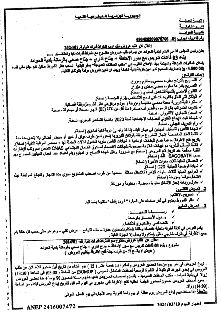 إعلان عن طلب عروض مفتوح 2024/01 بلدية الحوامد