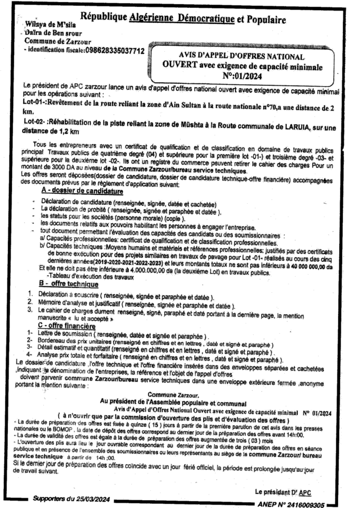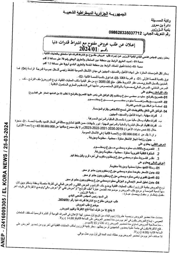 إعلان عن طلب عروض مفتوح 2024/01 بلدية الزرزور