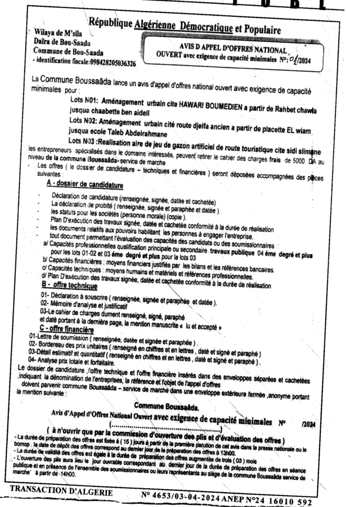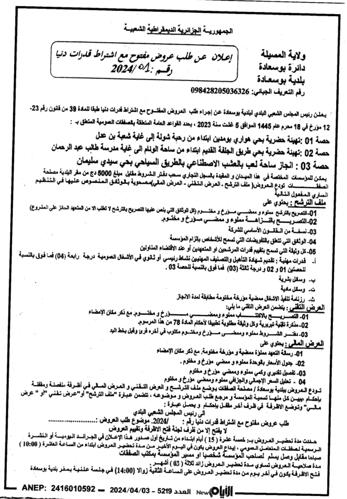إعلان عن طلب عروض مفتوح 2024/01 بلدية بوسعادة