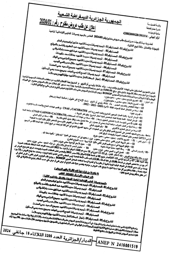 إعلان عن طلب عروض مفتوح 2024/01 بلدية تارمونت