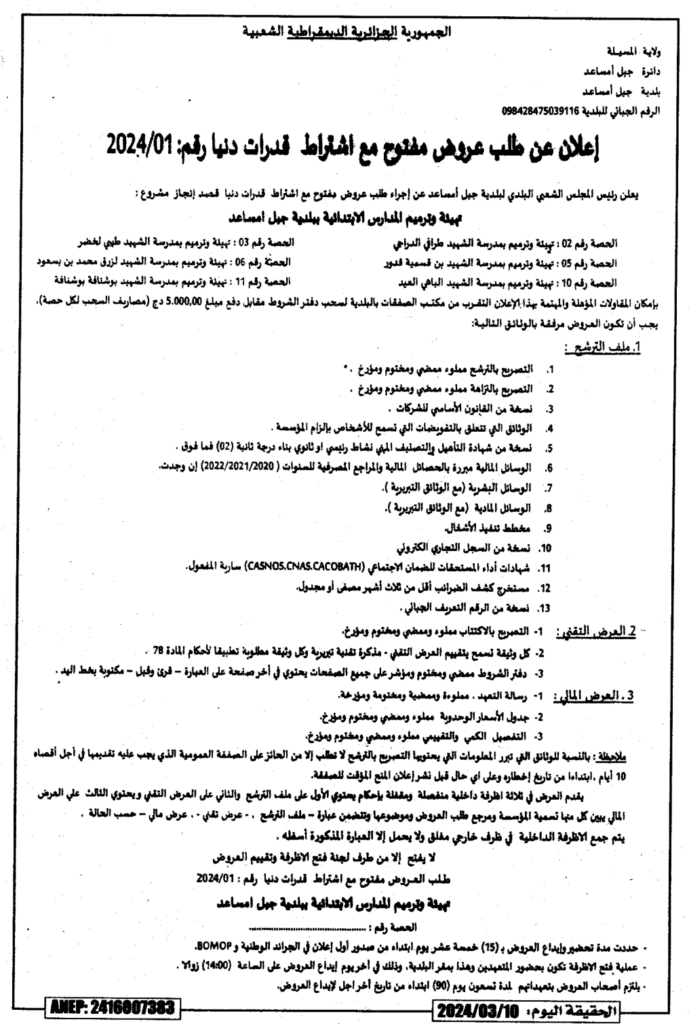 إعلان عن طلب عروض مفتوح 2024/01 بلدية جبل امساعد