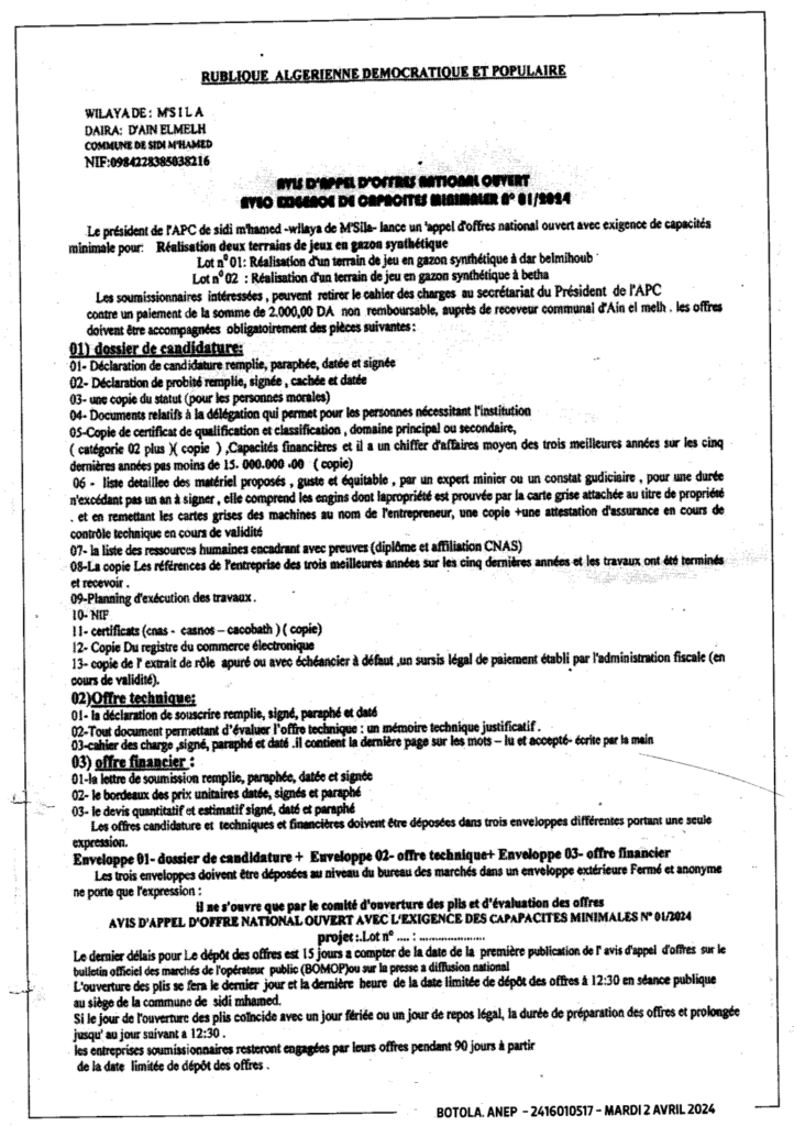 إعلان عن طلب عروض مفتوح 2024/01 بلدية سيدي امحمد