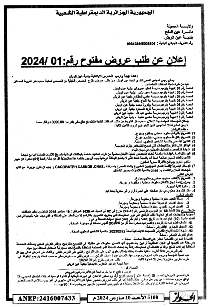 إعلان عن طلب عروض مفتوح 2024/01 بلدية عين الريش