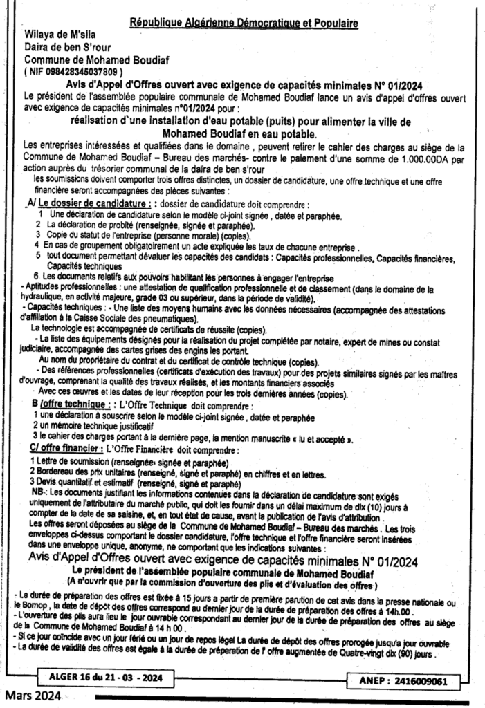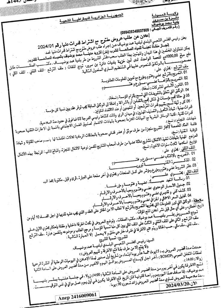 إعلان عن طلب عروض مفتوح 2024/01 بلدية محمد بوضياف