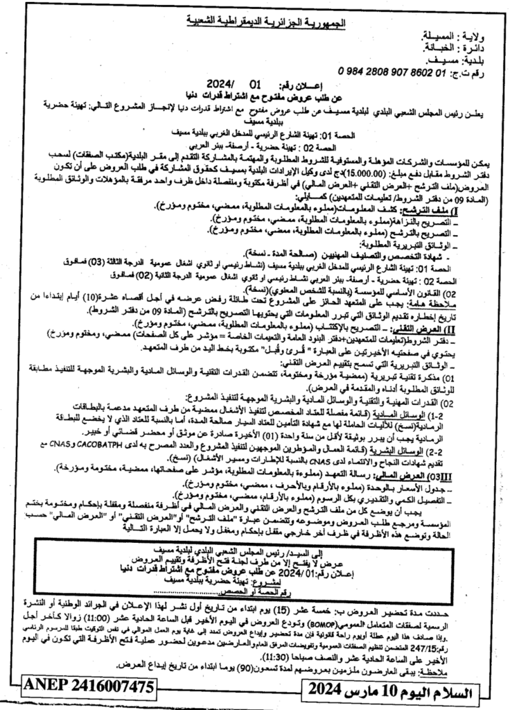 إعلان عن طلب عروض مفتوح 2024/01 بلدية مسيف