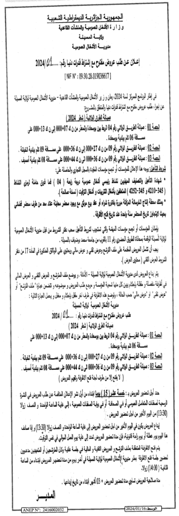 إعلان عن طلب عروض مفتوح 2024/01 مديرية الأشغال العمومية لولاية المسيلة