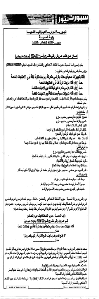إعلان عن طلب عروض مفتوح 2024/02 (بعد عدم جدوى)/ مديرية النشاط الاجتماعي والتضامن بولاية المسيلة
