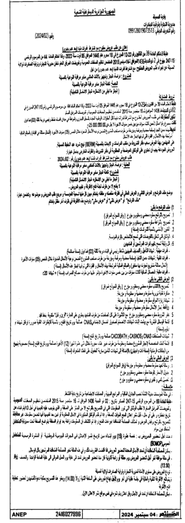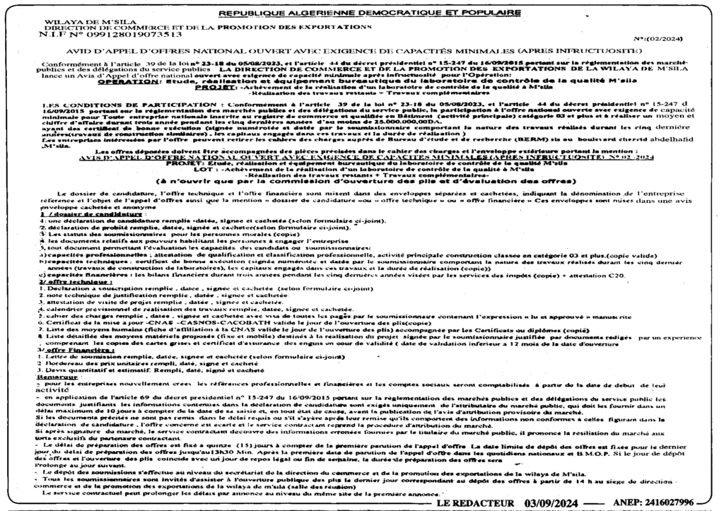 إعلان عن طلب عروض مفتوح 2024/02 (بعد عدم جدوى)/ مديرية التجارة وترقية الصادرات لولاية المسيلة