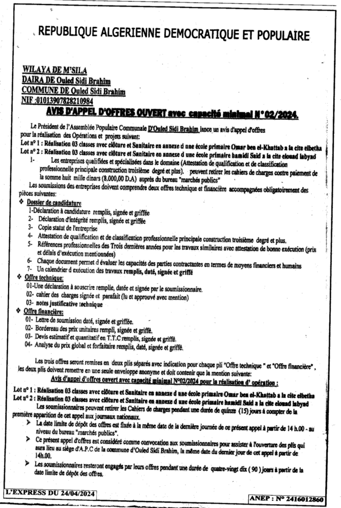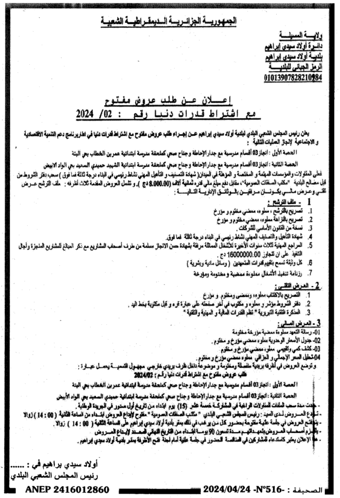 إعلان عن طلب عروض مفتوح 2024/02 بلدية أولاد سيدي ابراهيم
