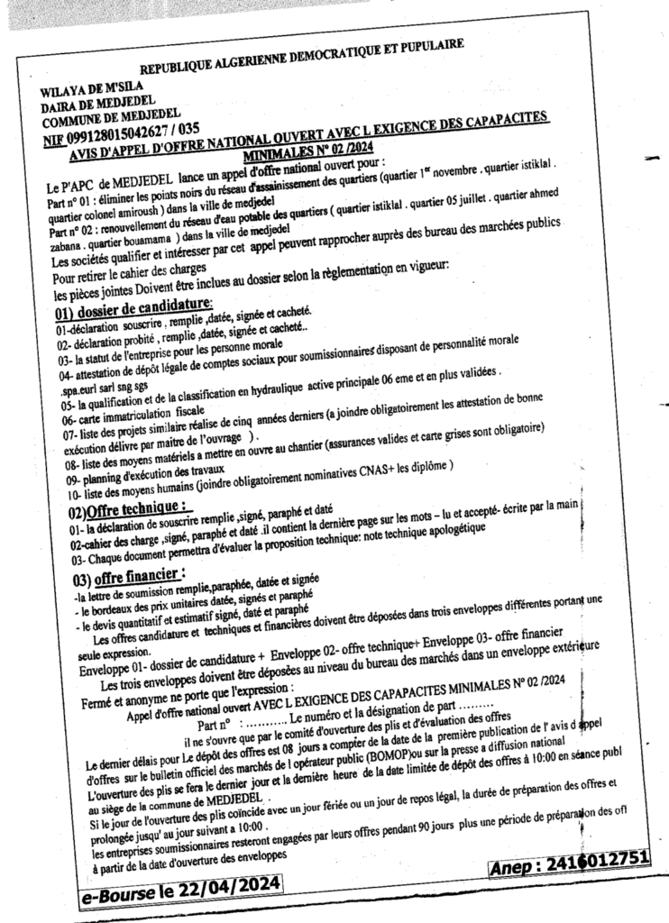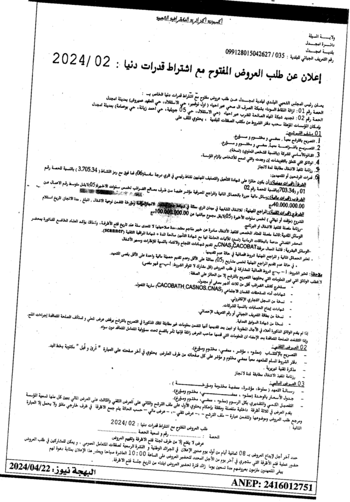 إعلان عن طلب عروض مفتوح 2024/02 بلدية امجدل