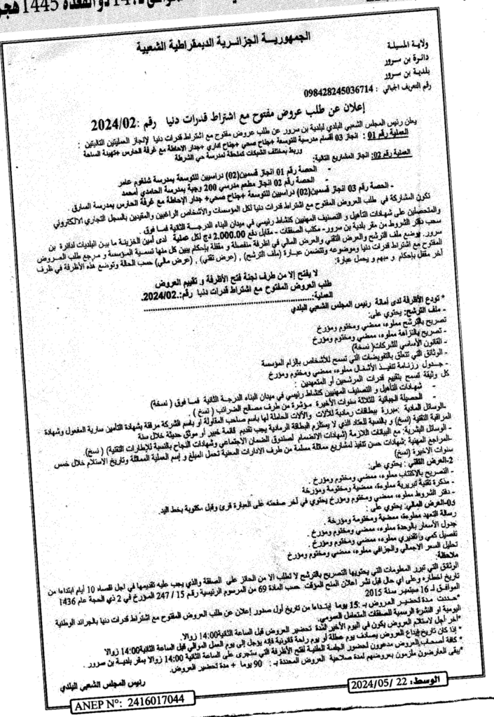 إعلان عن طلب عروض مفتوح 2024/02 بلدية بن سرور