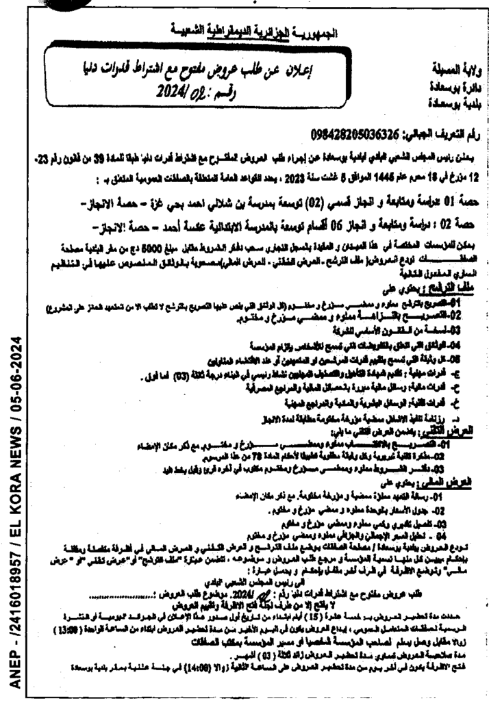 إعلان عن طلب عروض مفتوح 2024/02 بلدية بوسعادة