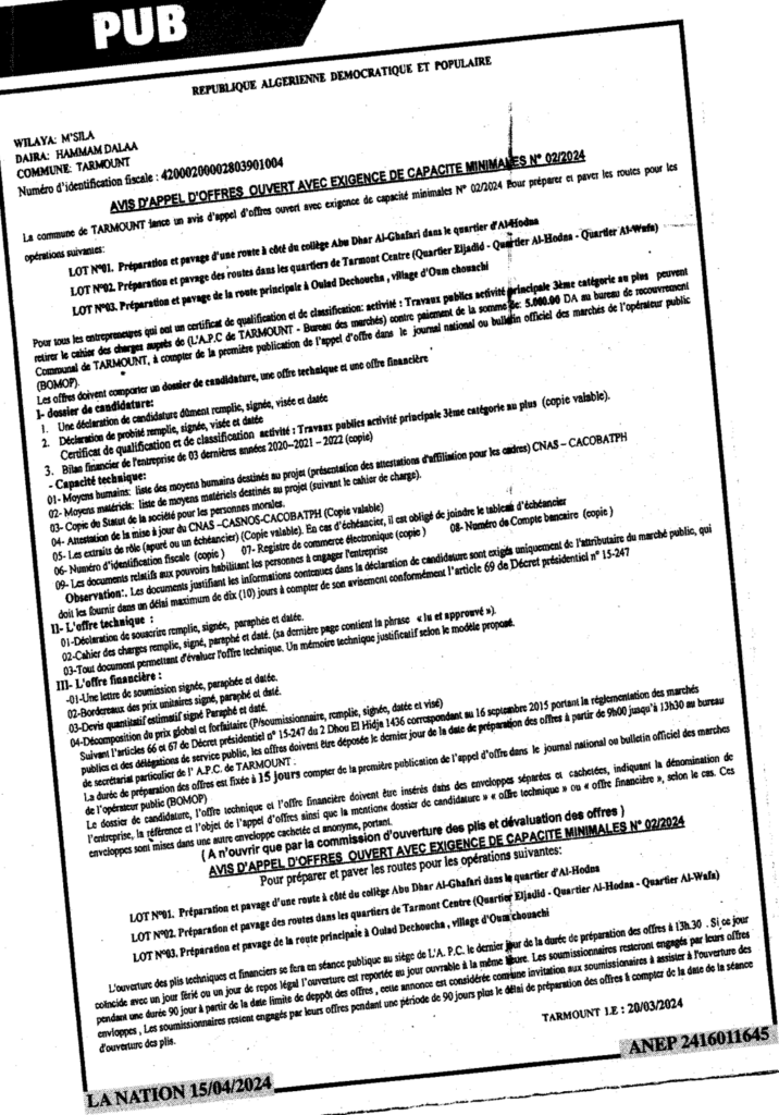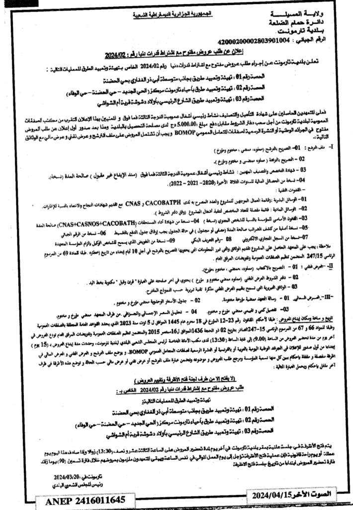 إعلان عن طلب عروض مفتوح 2024/02 بلدية تارمونت