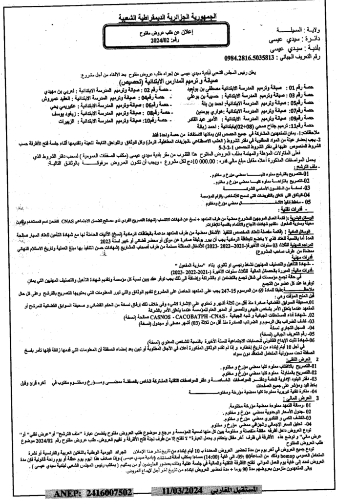 إعلان عن طلب عروض مفتوح 2024/02 بلدية سيدي عيسى