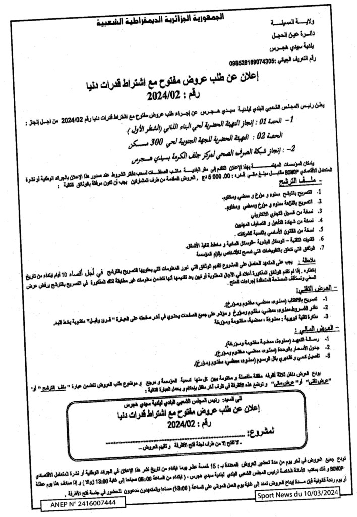 إعلان عن طلب عروض مفتوح 2024/02 بلدية سيدي هجرس